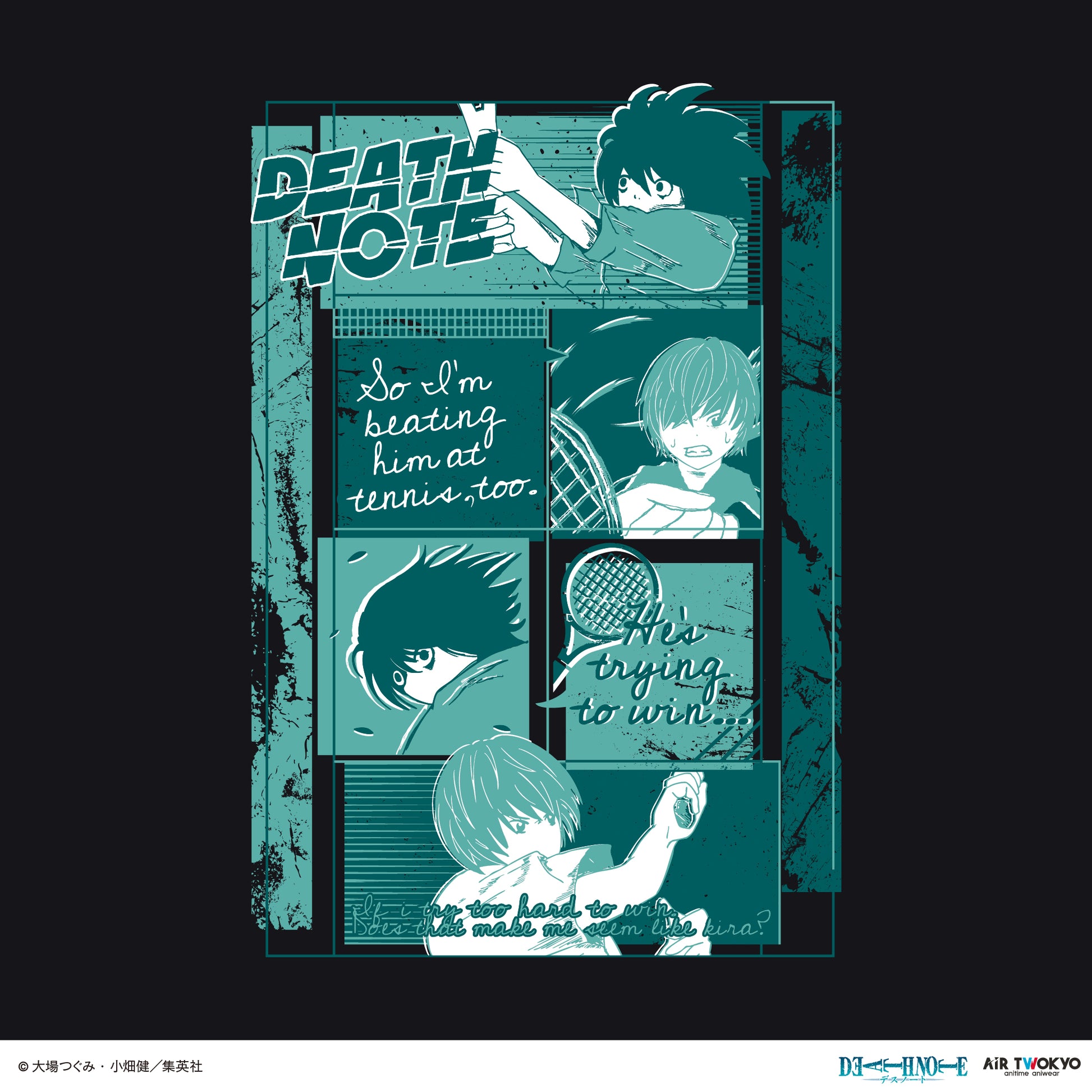 夜神月とLがテニスで対戦するシーンを、やわらかく可愛らしいタッチで描いたデザインTシャツ。